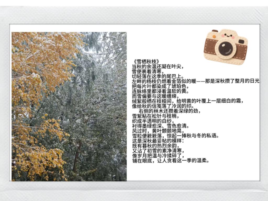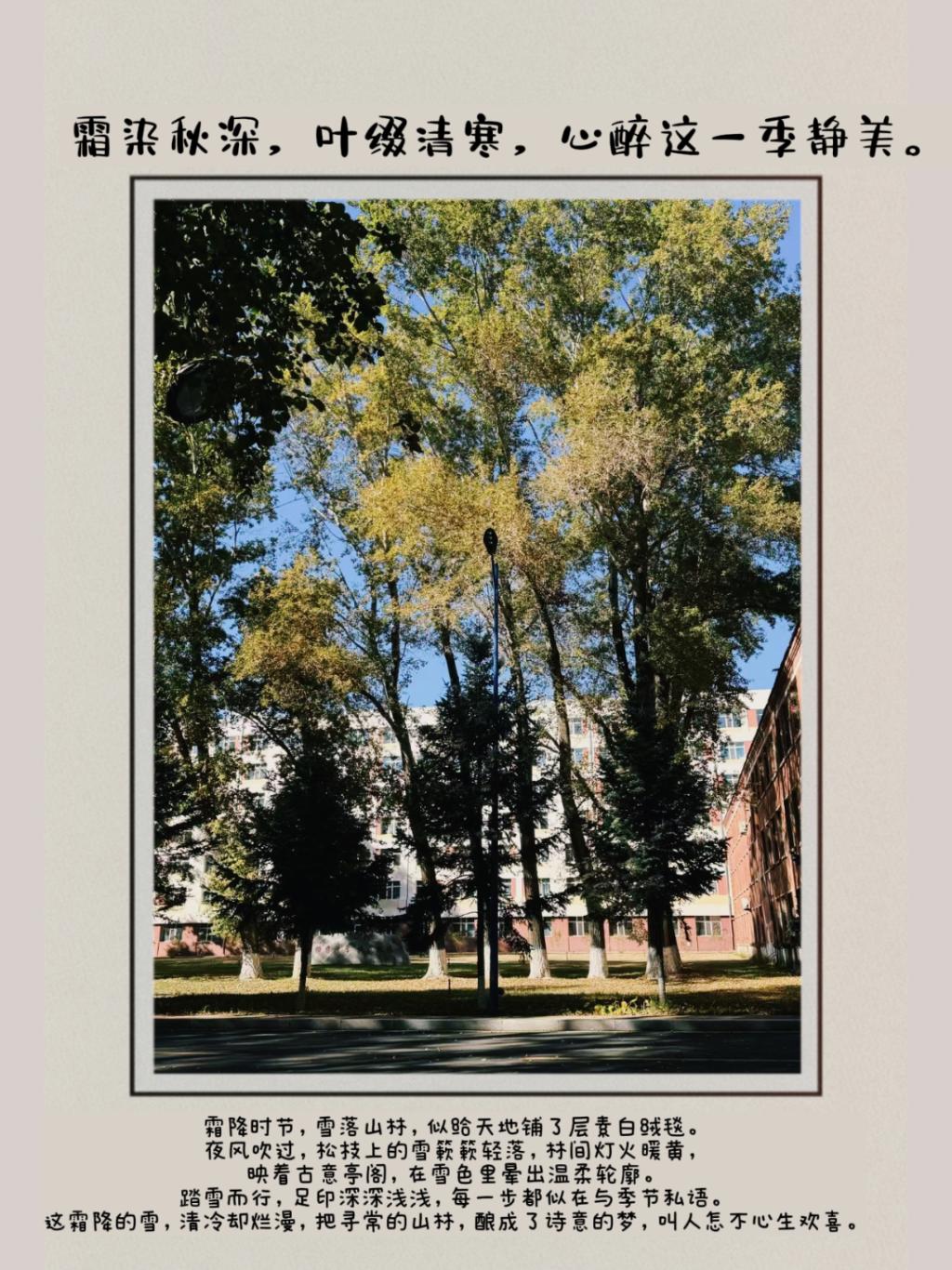 随着秋意渐浓,大地逐渐被金色覆盖,我们迎来了二十四节气中的霜降,为了加深同学们对霜降节气的理解和认识,同时引导大家关注自然变化,感受季节之美,艺术设计学院特此策划了“秋尽霜至,冬来雁归”主题活动。请欣赏艺设学子优秀的作品。