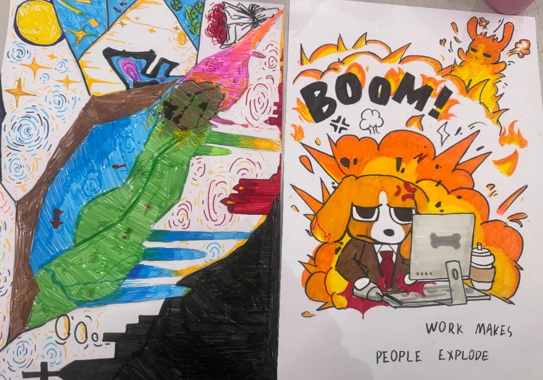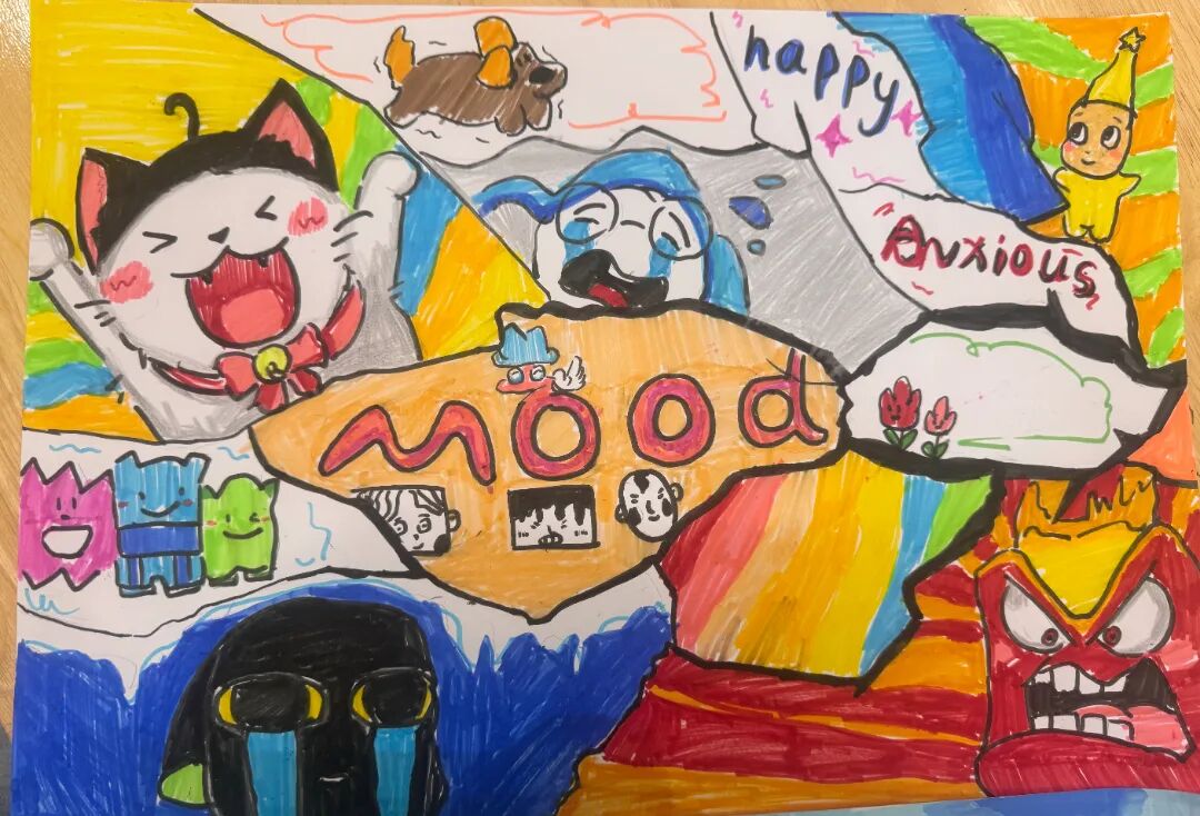 活动伊始,同学们围绕统一创作主题——“我的情绪调色盘”,以自由形式展开绘画创作。他们在画布或画纸上,使用丙烯、水彩等颜料进行创作,将内心的情感、压力或希望转化为独特的视觉画面。活动过程中,大家全身心地投入,让这场活动成为了一场情感与智慧绽放的盛会。活动尾声,同学们将绘画作品进行集中展示,让个人私密的情感图画转化为公共艺术景观,并表示逐步认识到情绪觉察的重要性。