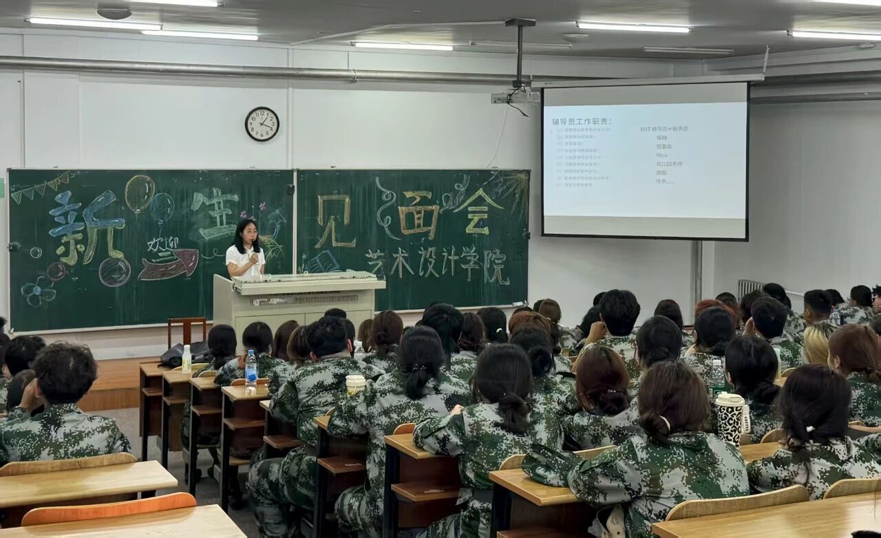 牟骀老师从辅导员是做什么工作的、大学应该怎样有意义的度过、了解军训期间训练要求以及相关学生管理规定等方面入手,让新生尽快适应大学生角色。从坚持自律、发展特长、专注提升、学业规划、学科认知、理想信念等多个方面,给新同学们提出建议、明确要求、加油鼓劲。亮明校规校纪,要求学生树立安全意识、法制意识。随后,牟老师向2025级新生介绍了艺术设计学院的基本情况、专业特色以及大学学习生活的特点,指出大学是充满机遇与挑战的舞台,新生们要尽快转变角色,学会自主学习与自我管理,同时积极参与各类学术和文化活动以拓宽视野。