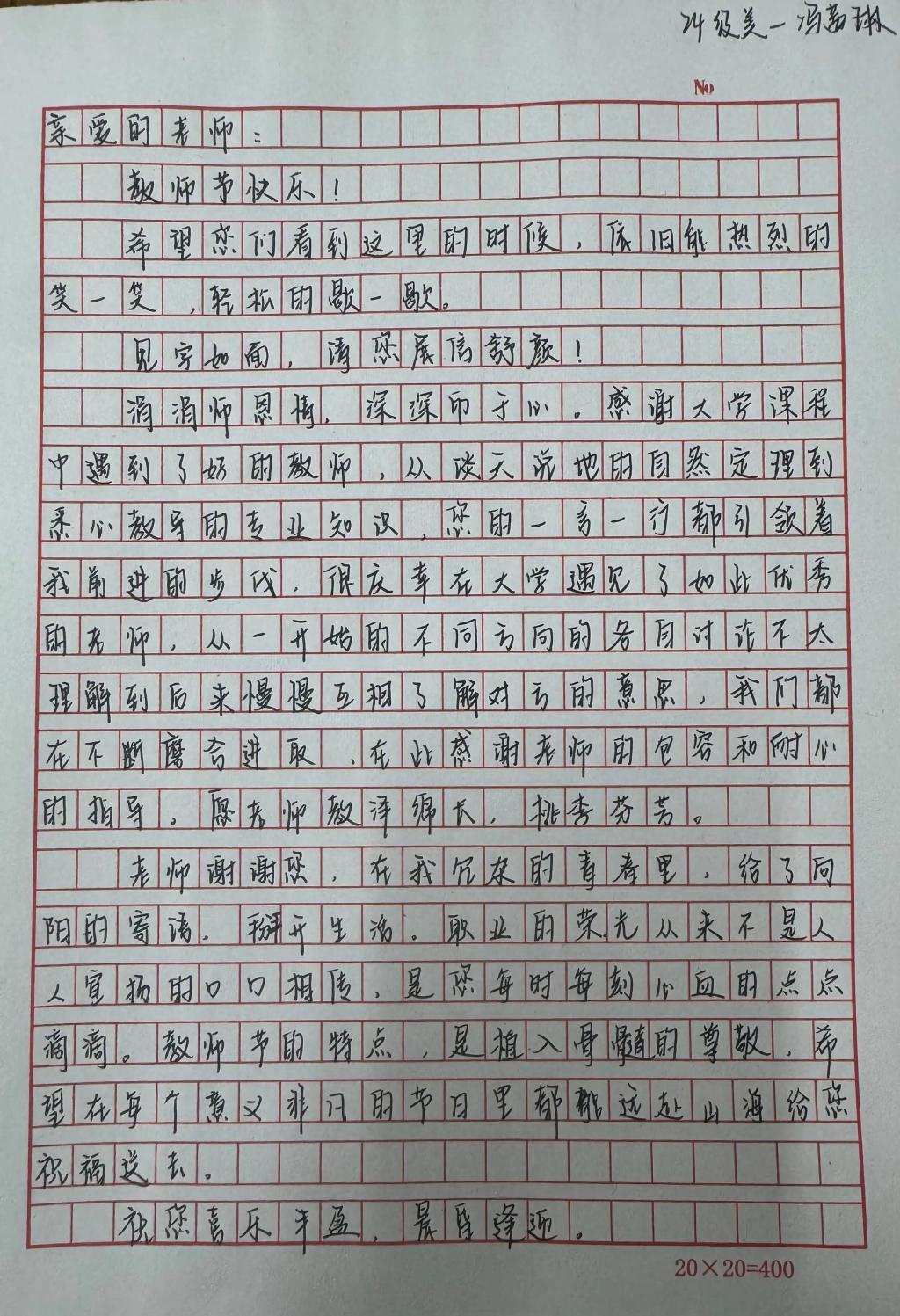 尊师重教,是中华民族传承千年的美德。老师们如春风化雨,言传身教点亮我们求知的路径,用温暖与智慧陪伴我们成长。她们默默耕耘,不求回报,却在我们的人生轨迹中留下深刻而明亮的光芒。为表达对辛勤耕耘在教育事业的老师们的深深感激,艺术设计学院精心策划了“师情画意,感谢有你”教师节主题活动,让我们共同欣赏艺设学子的优秀作品吧!