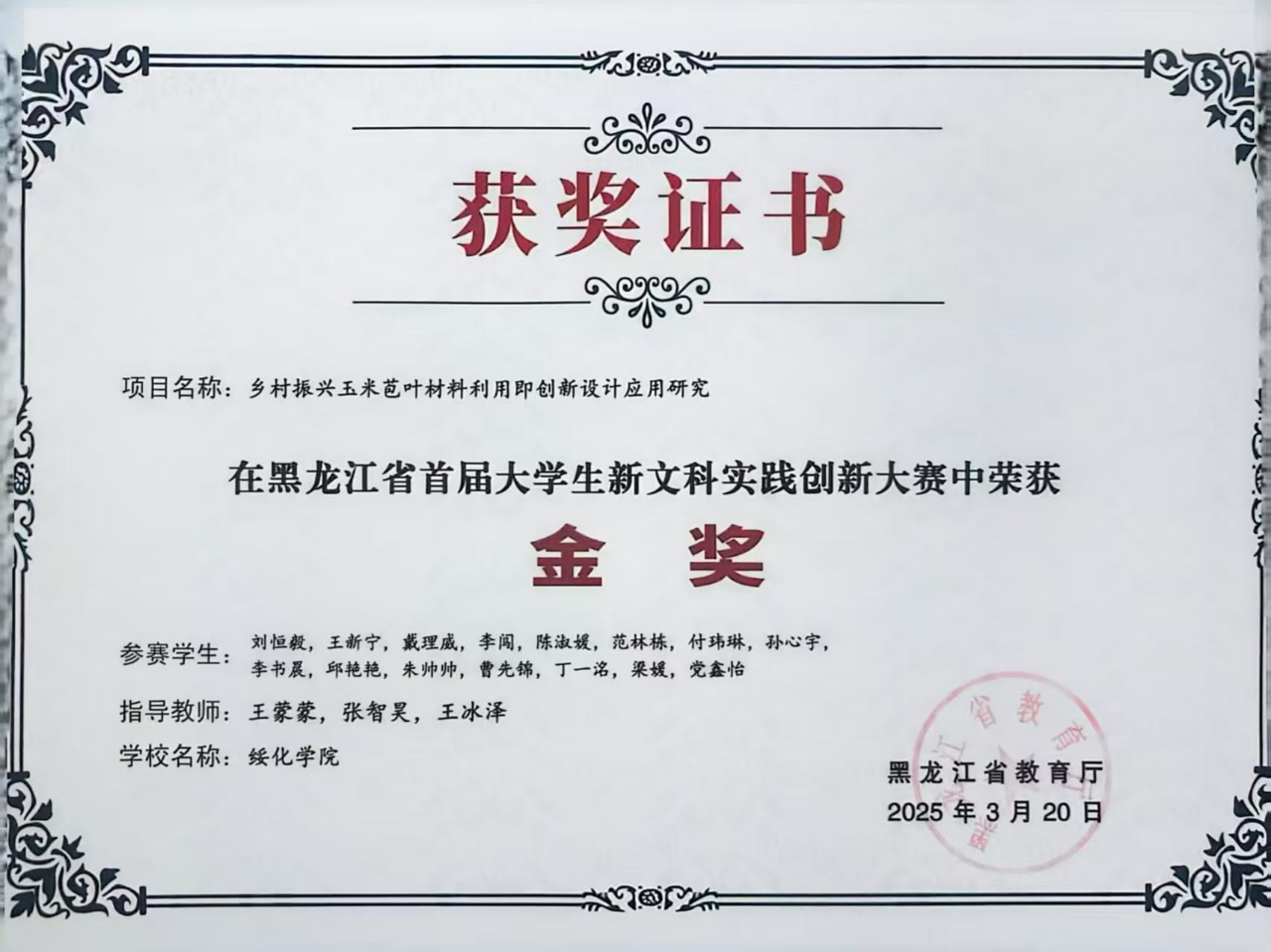 在黑龙江首届大学生新文科实践创新大赛中活动金奖。