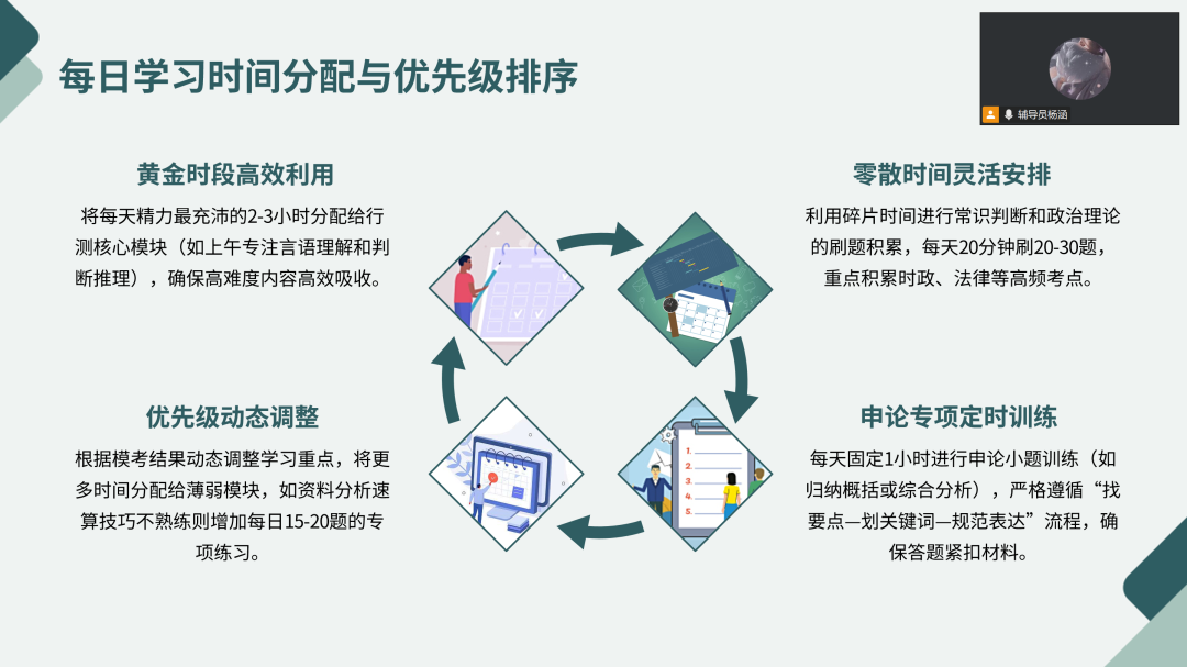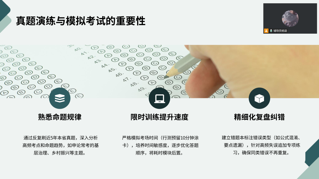 随后,杨老师详解行测五大模块,提炼速算、规律总结、排除法等实用技巧;拆解申论各类题型写作要点,强调“抓要点、扣材料、讲逻辑”原则。备考规划方面,杨老师从短长期维度给出方案:短期合理分配时间,黄金时段攻克行测核心模块,碎片时间积累常识,固定时段训练申论;长期遵循“基础→强化→冲刺”阶段规划,配合真题演练与模拟考试,通过限时训练提速、复盘纠错避错。学子们纷纷表示颇有收获。