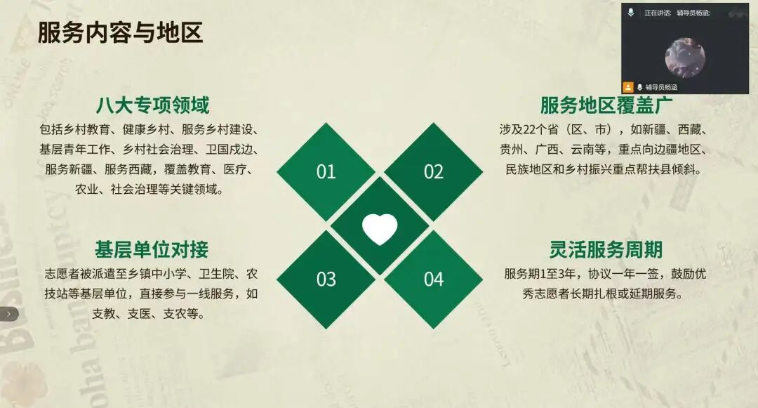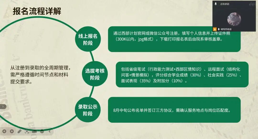 讲座伊始,杨涵老师首先详细介绍了西部计划的服务内容、服务地区、以及岗位类型,重点讲解了报名方式与时间节点、选拔的具体流程与考核标准,并通过流程图清晰地展示了从报名、资格审核、笔试面试、岗位分配到最终公示录用的完整环节,提醒同学们密切关注官方通知,提前准备好相关材料。同时,杨涵老师强调,扎实的专业能力、坚定的服务意愿和良好的综合素质是选拔的关键。