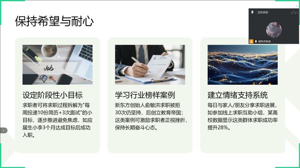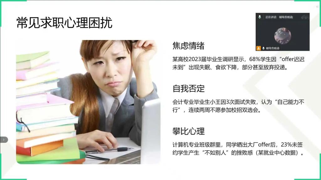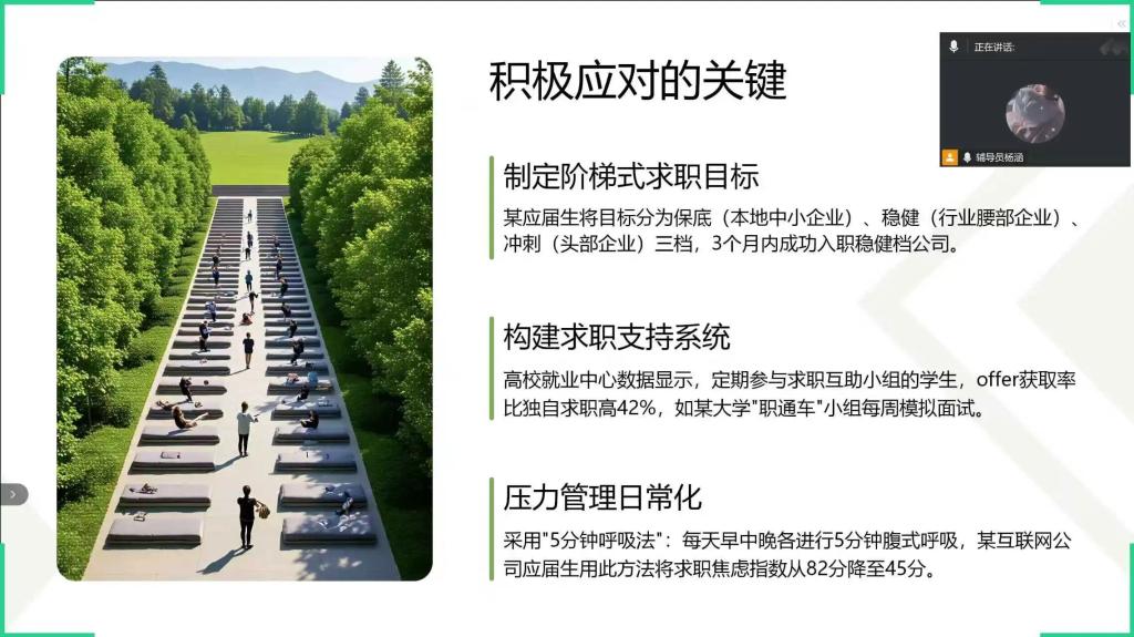 辅导会上,杨涵老师围绕对于应届生常见的就职困扰进行阐述,提出积极应对的关键。杨老师提出,越焦虑,越要把注意力放回自己身上,少看别人的进度,多专注自己的节奏。认真完成手头工作,脚踏实地,用具体的行动,代替胡思乱想。